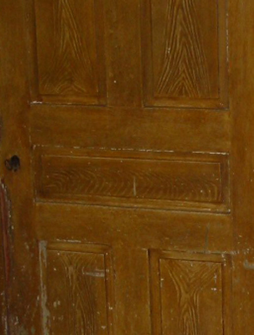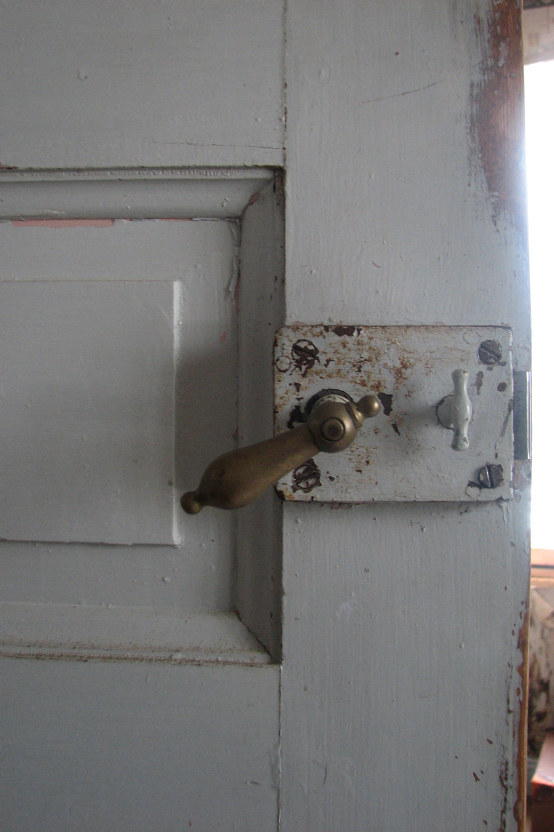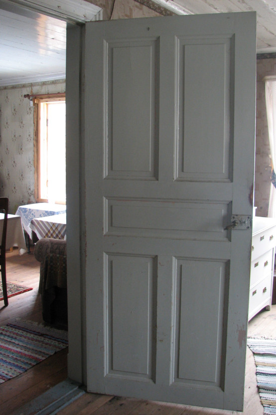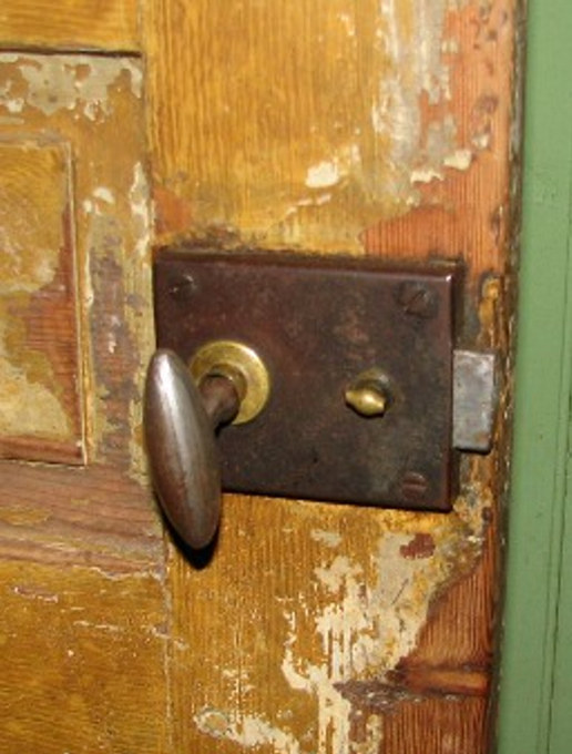 | Ådringsmålad spegeldörr i köket. | Utanpåliggande kammarlås med vred. |