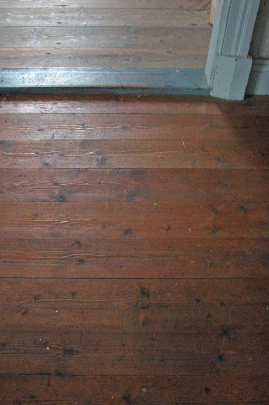 Golv av brädor eller plankDefinition av bräda respektive plank: brädan är av klenare dimensioner jämfört med en planka. I äldre handböcker går gränsen för en bräda vid 2 tums tjocklek och 6 tums bredd, däröver kallas det plank. En ”modern” bräda är under 45 millimeter tjock. Under första hälften av 1800-talet var det vanligast med kilsågade brädor. Det innebär att brädan har en bredare och en smalare ända, på grund av att träden är grövre i rotändan och smalnar av mot toppen. Brädorna läggs så att dessa breddskillnader jämnar ut sig. Vanligtvis spikas bräderna fast i bjälkarna rakt ovanifrån. Brädorna fästes samman i varandra med trä- eller järnnaglar. En annan metod är att hyvla in en not i brädan och använda en lös fjäder som sammanfogning. Under senare delen av 1800-talet börjar golv av maskintillverkade brädor dyka upp. Golv med sådana brädor är skråspikade i fjädern så att spikarna döljs av nästa bräda. |